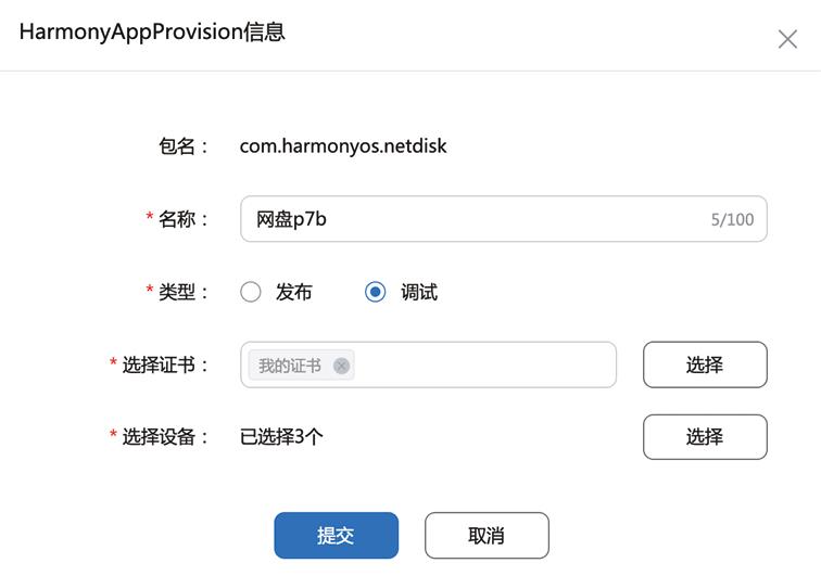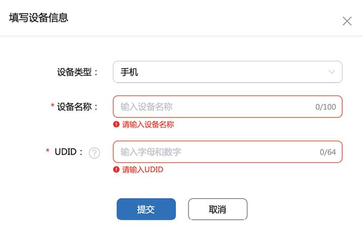 进入该页面后,在左侧导航栏选择“设备管理”,进入设备管理页面。然后单击右侧的“添加设备”按钮,会弹出图1—29所示的窗口。这里需要选择设备类型,输入设备名称和UDID,然后单击“提交”按钮添加设备。只有在这里添加的设备才能使用前面申请的证书安装HarmonyOS App。