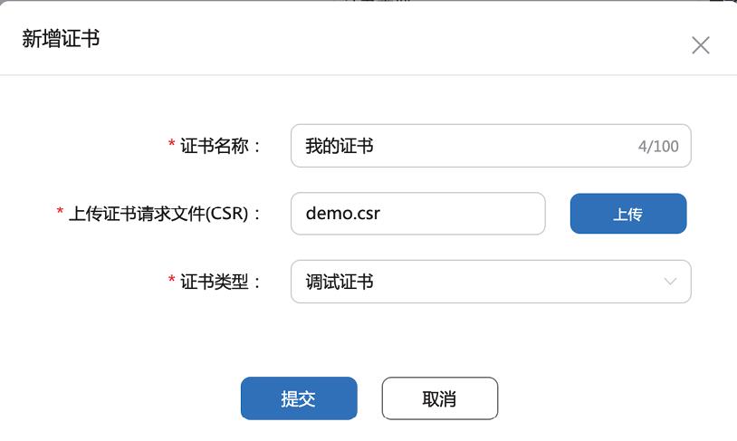 进入该页面后,在左侧导航栏选择“证书管理”选项,进入证书管理页面,单击“新增证书”按钮弹出新增证书窗口,并按要求输入相应的内容,如图1—27所示。