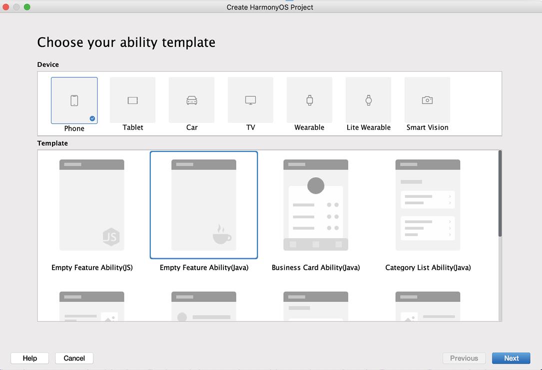 将HarmonyOS App在手机上部署,需要对hap文件签名。首先通过Create HarmonyOS Project窗口创建一个Phone工程,如图1—35所示。这里选择Empty Feature Ability(Java)模板。