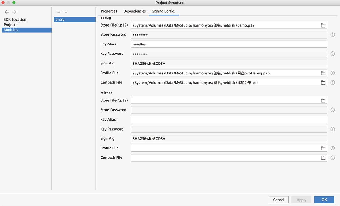 创建完工程后,选择File→Project Structure菜单项,打开Project Structure窗口,单击左侧的Modules,选择Signing Configs选项卡,进入配置页面,并按图1—37所示对签名文件进行配置。其中,Store Password和Key Password使用1.7.1节中生成demo.p12文件时使用的密码,本例是1234abcd。配置完后,单击OK按钮保存配置。