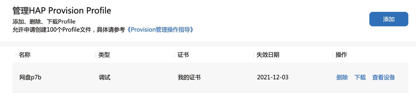 成功添加HAP Provision Profile后,会在列表中显示刚才创建的HAP Provision Profile,如图1—33所示。单击右侧“下载”链接,就会下载一个名为“网盘p7bDebug.p7b”的文件。