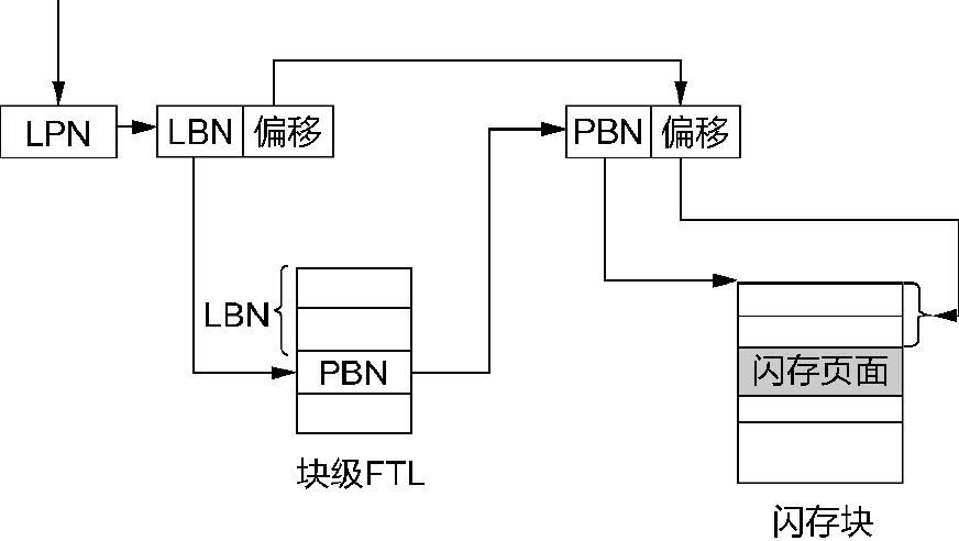 由于以块粒度进行映射,在进行地址转换时需要将逻辑地址分为LBN(Logical Block Number,逻辑块号)和块内偏移两部分,LBN通过FTL表项转换为PBN(Physical Block Number,物理块号),然后拼接块内偏移得到物理页级地址,如图2.14所示。对于LBN相同的页来说,它们一定在同一个物理块上,这就导致了在映射发生改变时可能需要移动大量的页。块级别的地址映射有效减少了映射表大小。