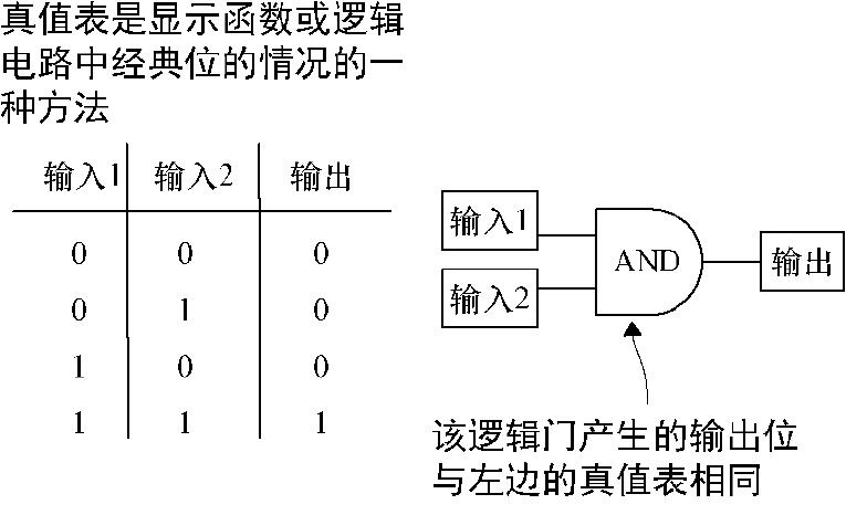 图2.7 逻辑操作AND的真值表。如果知道一个逻辑操作的整个真值表,就知道该操作对任何可能的输入分别有什么作用