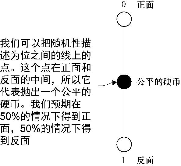 以这种方式对经典位进行可视化,还可以让我们稍微扩展位的概念,从而包括一种描述“随机”位的方式(这在后面会有所帮助)。如果我们有一枚“公平的硬币”(也就是说,这枚硬币抛落时有一半情况下是正面,另一半情况下是反面),那么将这枚硬币称为0或1是不正确的。只有将硬币的某一面朝上放在一个平面上时,我们才知道这个位处于什么值。我们也可以抛掷它来得到一个随机值。每次抛掷硬币,我们知道它最终会落地,我们会得到正面或反面。它是正面还是反面是由一种称作硬币“偏倚”的概率所决定的。我们必须选择硬币的一面来描述偏倚,这很容易表述为一个问题,如“硬币得到正面的概率是多少?”因此,一枚公平的硬币有50%的偏倚,因为它有一半的情况下正面朝上,这在图2.6中被映射为位值0。
