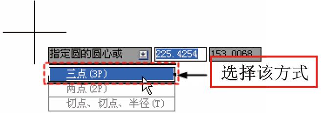 命令:CIRCLE↙指定圆的圆心或[三点(3P)/两点(2P)/切点、切点、半径(T)]:150,160(1点)指定圆的半径或[直径(D)]:40↙(绘制出A圆)命令:CIRCLE↙指定圆的圆心或[三点(3P)/两点(2P)/切点、切点、半径(T)]:3P↙(以三点法绘制圆,或在动态输入模式下按“↓”键,打开动态菜单,选择“三点”方式,如图2-12所示)
