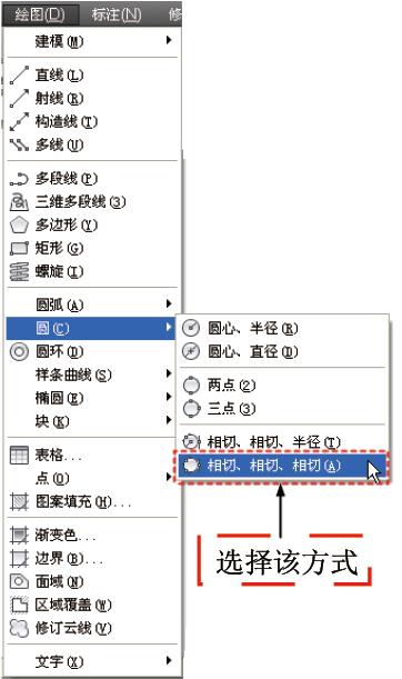 (4)相切、相切、相切(A):“绘图”的“圆”子菜单中多了一种“相切、相切、相切”的方法,当选择此方式时(见图2-10),系统提示如下: