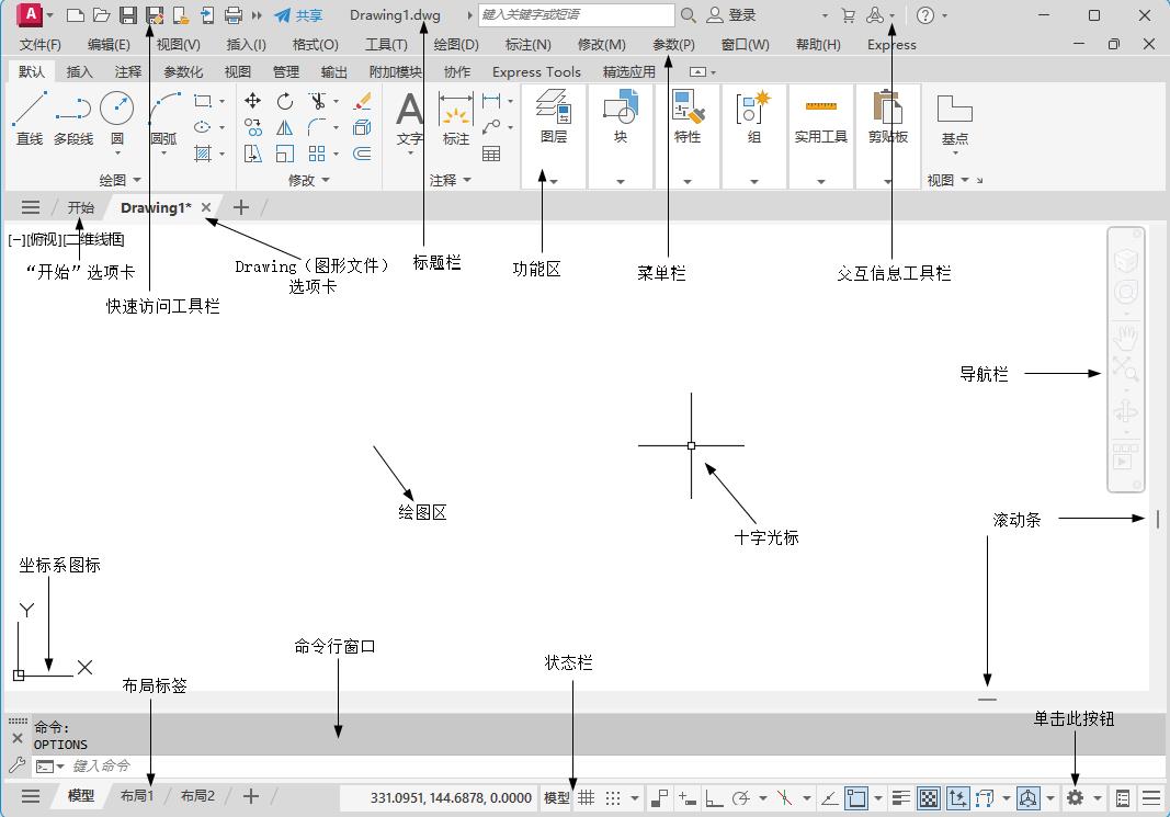 AutoCAD经典风格的界面包括标题栏、绘图区、十字光标、菜单栏、导航栏、坐标系图标、命令行窗口、状态栏、布局标签和快速访问工具栏等。