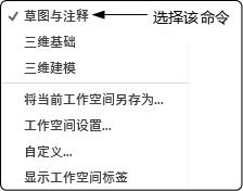 ,如图1-1所示,在弹出的菜单中选择“草图与注释”命令,如图1-2所示,可切换到AutoCAD经典风格的界面。