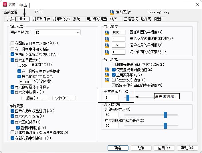 在操作界面中选择“工具”菜单中的“选项”命令。屏幕上将弹出“选项”对话框。打开“显示”选项卡,在“十字光标大小”区域的文本框中直接输入需要的数值,或者拖动文本框后的滑块,对十字光标的大小进行调整,如图1-3所示。