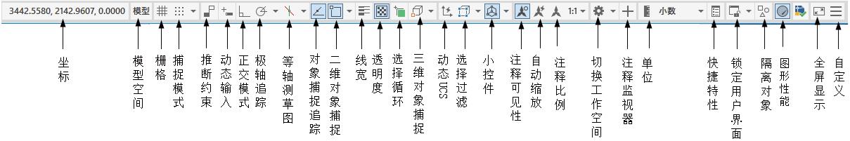 状态栏在AutoCAD操作界面的底部,依次有“坐标”“模型空间”“栅格”“捕捉模式”“推断约束”“动态输入”“正交模式”“极轴追踪”“等轴测草图”“对象捕捉追踪”“二维对象捕捉”“线宽”“透明度”“选择循环”“三维对象捕捉”“动态UCS”“选择过滤”“小控件”“注释可见性”“自动缩放”“注释比例”“切换工作空间”“注释监视器”“单位”“快捷特性”“锁定用户界面”“隔离对象”“图形性能”“全屏显示”“自定义”30个功能按钮,如图1-17所示。