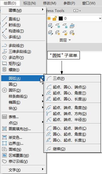 这种类型的命令后面带有一个小三角形。例如,单击“绘图”菜单,指向菜单中的“圆弧”命令,屏幕上就会显示“圆弧”子菜单中所包含的命令,如图1-6所示。