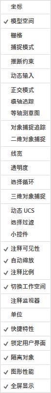 状态托盘中包含一些常见的显示工具和注释工具,包括模型空间与布局空间的转换工具,如图1-17所示。