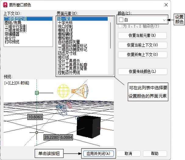 (2)单击“图形窗口颜色”对话框中“颜色”字样下的下拉箭头,在打开的下拉列表中选择需要的颜色,然后单击“应用并关闭”按钮。