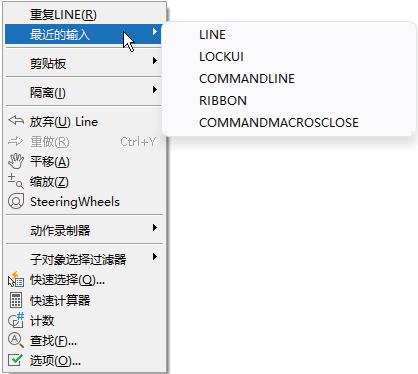 如果刚使用过要输入的命令,可以在命令行打开右键快捷菜单,在“最近的输入”子菜单中选择需要的命令,如图1-21所示。“最近的输入”子菜单中储存最近使用的5个命令。