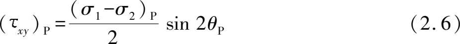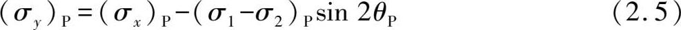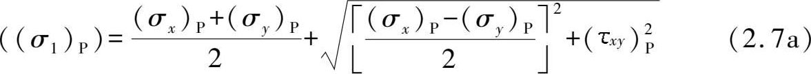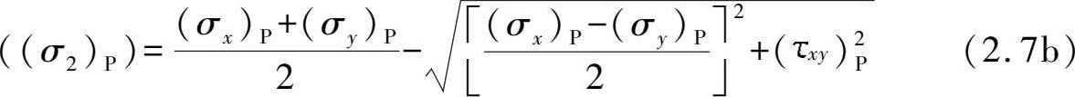 根据莫尔圆由式(2.4)至式(2.6)即可确定 P 点的最大主应力与最小主应力,如式(2.7a)、式(2.7b)所示。