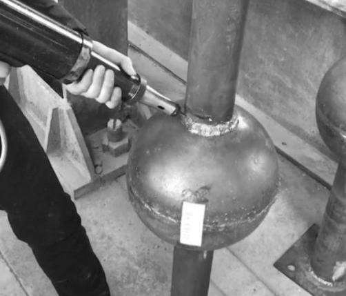 分析焊接空心球节点焊接残余应力分布规律的主要目的是考查其对节点承载力、刚度等力学性能的具体影响,因此,后文在分析焊接残余应力对空心球节点力学性能的影响时尚需建立无(或减小)焊接残余应力的试验对照组。课题组采用超声冲击法对对照组试件(试件设置情况详见表 2.1)进行焊接残余应力的消除。为便于描述,本节提前介绍其具体方法。