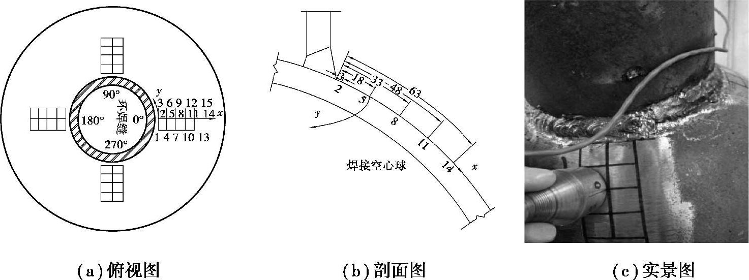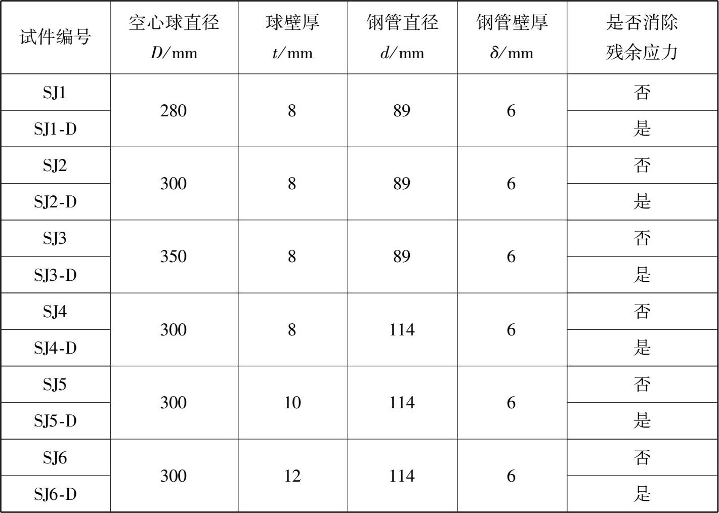 为保证本章分析结果能与实际工程相结合,可参考《空间网格结构技术规程》(JGJ 7—2010)和《钢网架焊接空心球节点》(JG/ T 11—2009),以工程中使用频率较高的焊接空心球节点为原型,制作 1∶1 足尺试验模型,在山区桥梁及隧道工程国家重点实验室(重庆交通大学)内采用磁测法开展焊接空心球节点的焊接残余应力试验研究。