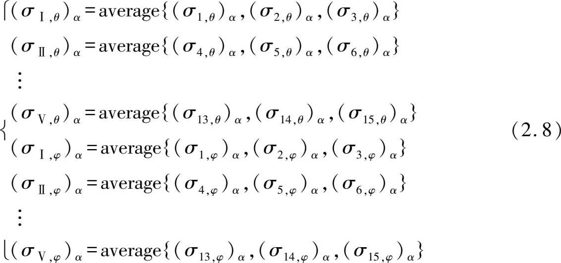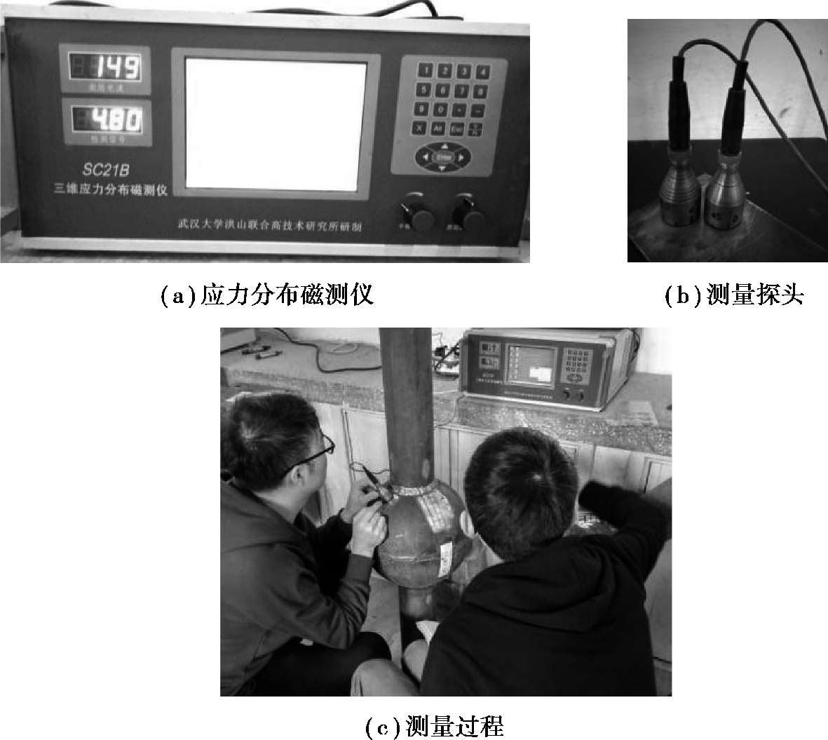 为不失代表性,从焊接起点开始沿环向每隔 90°设置成一个测试区,每个测试区沿经度方向均匀布置5 个测点,沿环向布置3 个测点,测量时将环向3 个测点的平均值作为该经度位置的应力值,如式(2.8)所示,式中每个括号( )外的下标 α 表示沿环向的角度位置,可取 0°,90°,180°,270°; σ Ⅰ, θ , σ Ⅰ, φ 分别表示沿经度方向第Ⅰ个测点的环向应力和经向应力平均值,其余类似; σ 1, θ , σ 1, φ 分别表示图 2.5 所示第1 个网格测点的环向应力和经向应力,其余类推。测量时采用SC21B三维应力分布磁测仪,如图 2.6 所示。