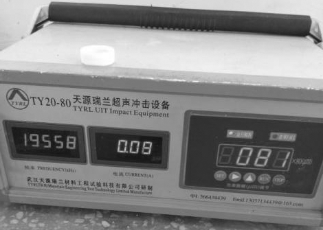 首先将超声冲击设备与冲击枪进行正确连接,然后将冲击设备上的频率调至 20 000 Hz,用冲击枪以 2 cm / min的均匀速度对焊缝进行正面连续冲击,冲击过程中维持冲击枪与焊缝的垂直以及冲击撞针与焊缝的持续接触。如图 2.7所示为试验中所采用的超声冲击设备,其型号为TY20-80,图 2.8 所示为课题组试验人员正在进行超声冲击消除焊接残余应力。