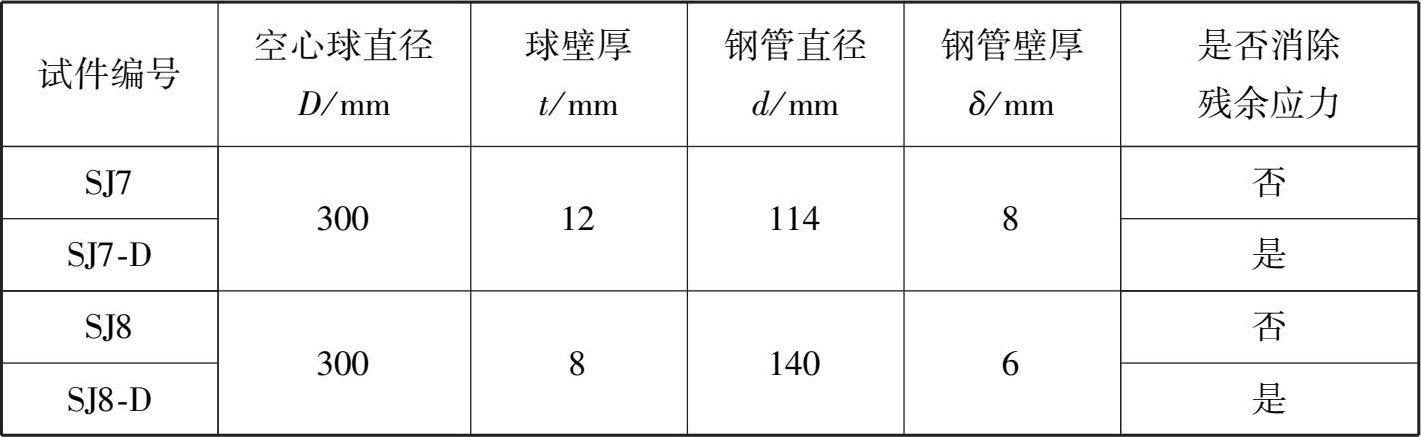选取工程中使用频率较高的焊接空心球节点和圆钢管,同时为考查空心球直径 D 、壁厚 t ,以及钢管直径 d 、壁厚 δ 对节点焊接残余应力分布模式的影响规律,基于正交试验设计思想以及《空间网格结构技术规程》(JGJ 7—2010)和《钢网架焊接空心球节点》(JG/ T 11—2009),设计 8 组试件开展焊接空心球节点球-管对接焊缝焊接残余应力试验研究,试件的具体几何尺寸见表 2.1,单侧钢管长度 h 均取 470 mm,空心球节点及钢管均采用Q235 钢材,且为同一批次。