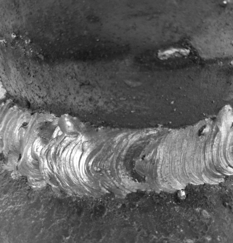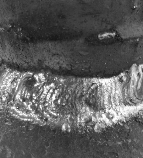 超声冲击前后的焊缝外观对比图如图 2.9 和图 2.10 所示,可以看出,超声冲击后,在焊缝表面产生较大的塑性变形,有一种颗粒感,表层的金属晶格发生了变化,焊缝表层金属晶粒细化。