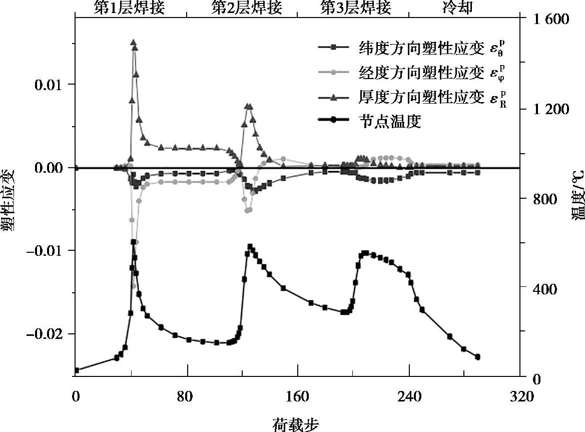 沿空心球厚度方向、经度方向、纬度方向的塑性应变演变规律及其产生的原因和钢管上的关键点 1 与关键点 2 相似,限于篇幅不再详细描述其演变过程。从图 2.25 中可以看出,在空心球外表面、钢管内侧的节点 3 处,多层焊接能起到类似热处理的作用可减小塑性应变,在第1 层焊接结束时,关键点 3 处残余塑性应变分别为