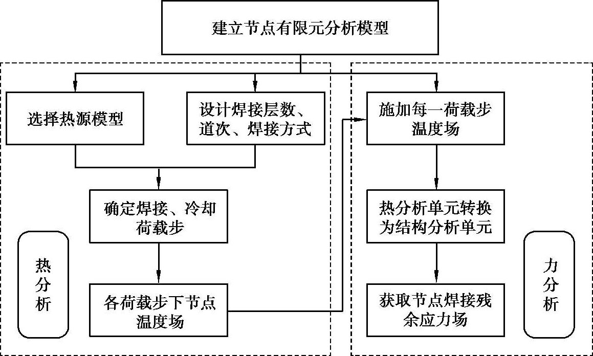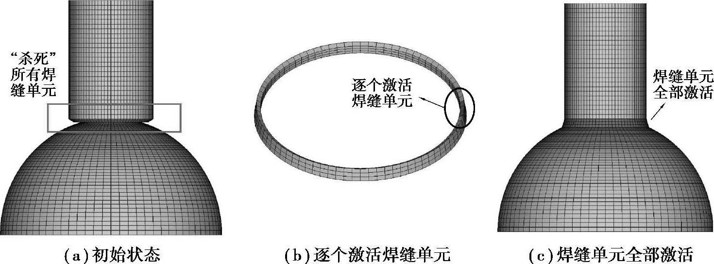 对焊接球的球-管焊接过程,其模拟的具体过程为:初始时刻将所有焊缝单元设置为“死亡”状态,如图 2.18(a)所示;然后由第1 层焊缝至第3 层从焊接起始点起,逐个激活各个焊缝单元,如图 2.18(b)所示。当某一焊缝单元被激活时,在此单元施加体生热率热源荷载,并删除前一被激活单元上的体生热率荷载,从而实现焊接热源的移动。在完成模型焊接热分析后转换分析单元,进行节点力学分析,提取热分析每一荷载步温度场分布结果,作为温度荷载再次施加在节点模型中并进行瞬态分析,最终得到节点的焊接残余应力分布,具体流程如图 2.19 所示。本模型中,焊接过程共 240 个荷载步,总时长为(80×∑ DT i )。如图 2.18(c)所示,所有焊缝单元被激活后则进入焊缝的冷却阶段,在冷却阶段模型与外界热量交换至模型整体恢复到室温 25 ℃。冷却时长共 80 min,分 20 个荷载步,每个荷载步步长 240 s,在第一个冷却荷载步中删除最后一个焊缝单元的体生热率。至此,完成球-管连接焊缝在焊接过程的热力学分析,然后将模型单元转化为力学分析单元,并在空心球对称面上施加对称约束,进行力学分析。