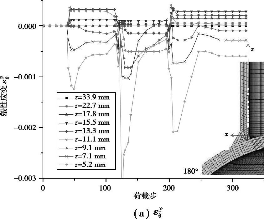 选取 180°截面处空心球内表面的所有节点,提取其在整个焊接过程中的塑性应变
