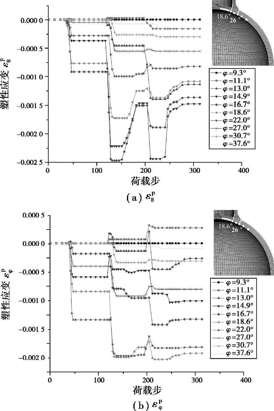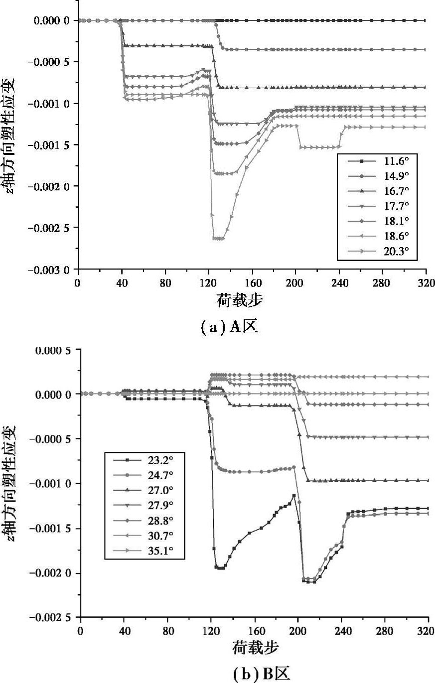 如图 2.33(a)所示为A区空心球厚度中心处节点的塑性应变演变曲线,所有节点均为压缩塑性应变;图 2.33(b)为B区空心球厚度中心关键节点的塑性应变演变曲线。分析图 2.33 中不同位置节点塑性演变曲线可知,在焊接第1层焊缝的过程中,空心球厚度中心塑性压缩区域边界在A、B区分别为 φ =14.9°位置和 φ = 24.7°位置,卸载区边界在A、B区分别为 φ = 18.1°位置和 φ =20.3°位置;在焊接第2 层焊缝的过程中,塑性压缩区域边界在A、B区分别为 φ =11.6°位置和 φ = 28.8°位置,卸载区边界在A、B区分别为 φ = 18.6°位置和 φ =24.7°位置;在焊接第3 层焊缝的过程中,塑性压缩区域边界在A、B区分别为 φ =18.6°位置和 φ = 30.7°位置,卸载区边界在A、B区分别为 φ = 20.3°位置和 φ =27.0°位置。与空心球外表面相比,卸载区域的范围明显缩短,说明在空心球厚度方向,随着距球外表面的距离增加,塑性卸载区逐渐减小。在各层焊接中,空心球厚度中心塑性应变临界位置见表 2.8。