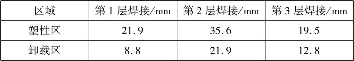 由图 2.29 可知,在焊接第1 层焊缝的过程中,与焊缝的距离超过 21.9 mm的区域将不会产生塑性变形,在距焊缝 8.8 mm范围内,塑性应变会因为热源远离材料冷却而明显卸载;在焊接第2 层焊缝的过程中,因热量积累增加,塑性变形范围将扩展到 35.6 mm,而冷却收缩卸载的范围也将扩展到 21.9 mm;在焊接第3 层焊缝的过程中,因钢管外侧整体温度升高导致材料强度降低,以及前两层焊接产生了残余塑性应变,两者相互作用后塑性变形范围缩小为 19.5 mm,冷却恢复范围也缩小到 12.8 mm。各层焊接中,钢管外表面塑性应变临界位置见表 2.4。