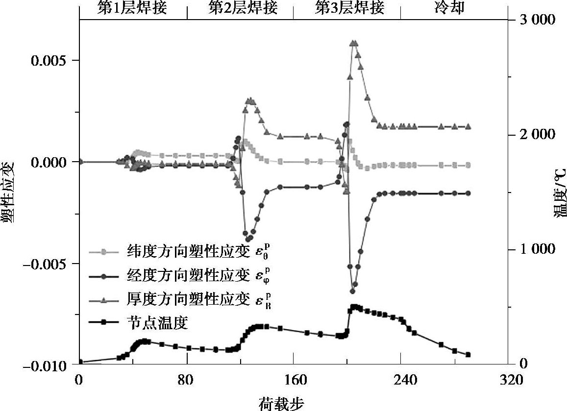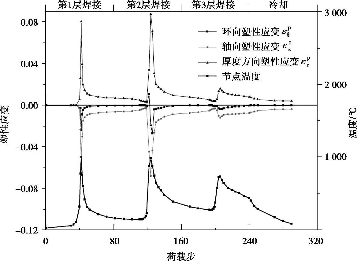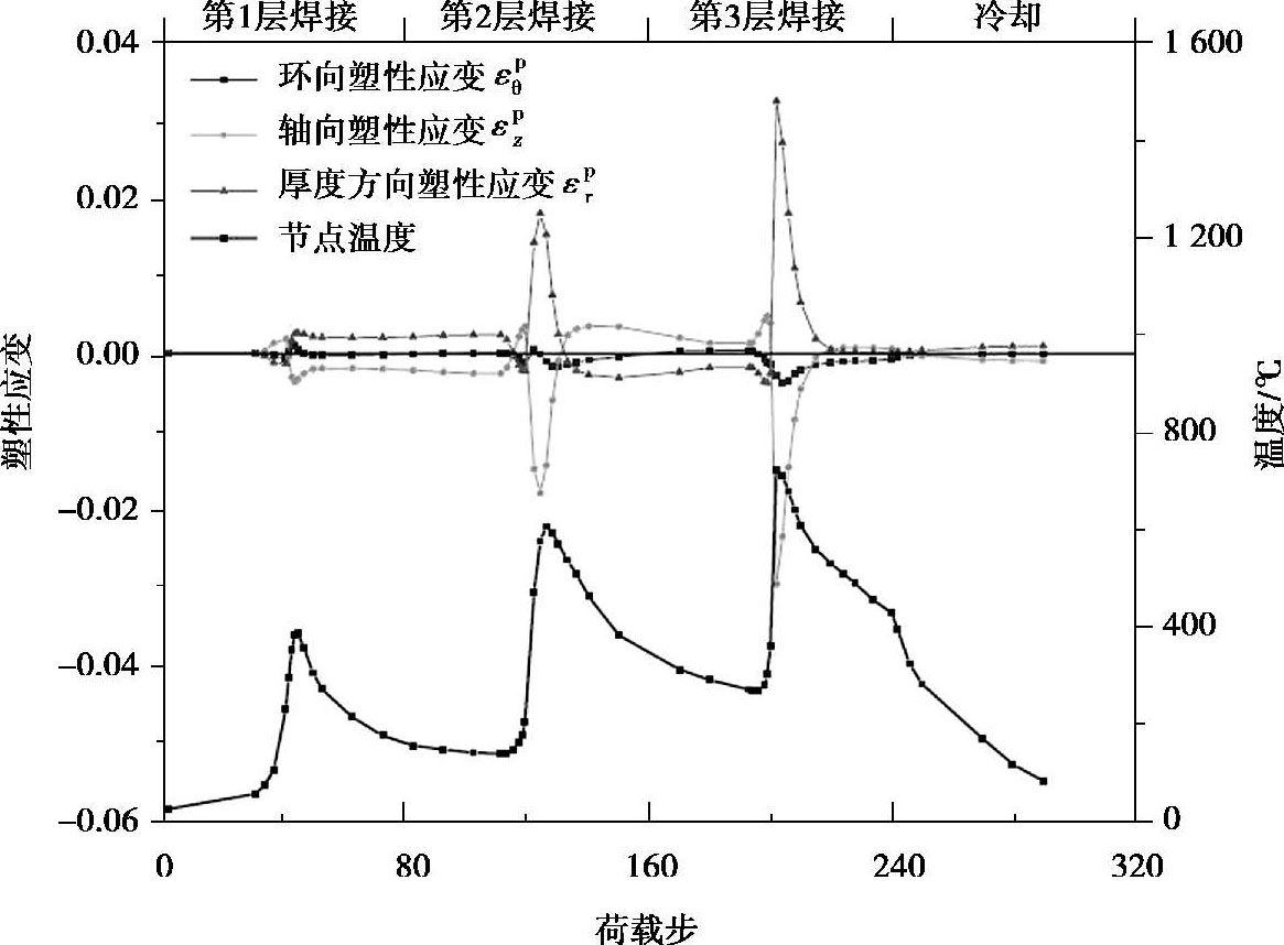 第3 层焊接与第2 层焊接相比,仅环向塑性应变变化规律略有不同,因整个焊接过程中关键点1 都不再处于热源中心膨胀拉伸区域,而不再有