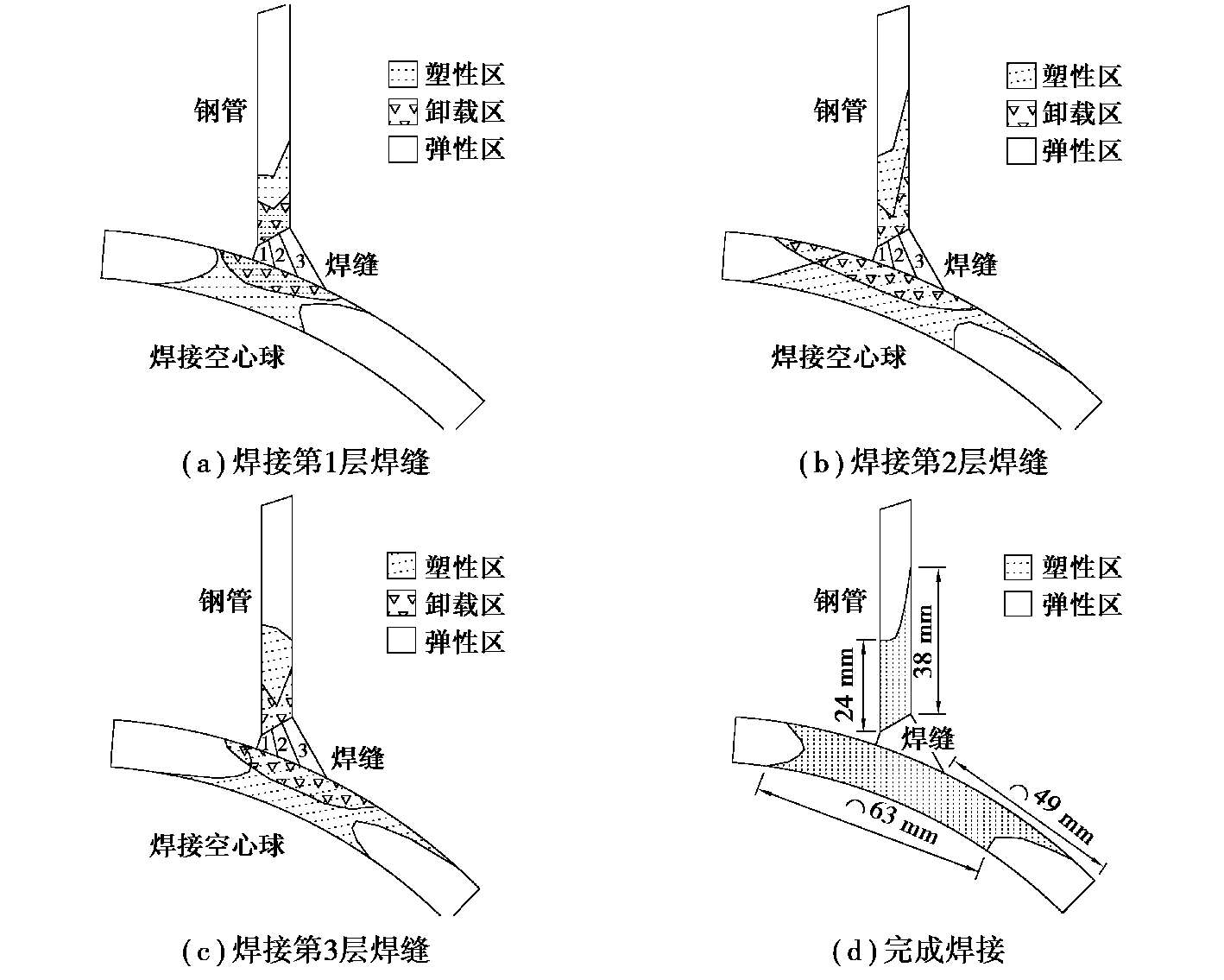 ③弹性区:远离焊缝一定距离后,钢管和焊接空心球受温度和塑性区域材料共同作用的影响不足以产生塑性应变,自始至终都保持在弹性范围内。
