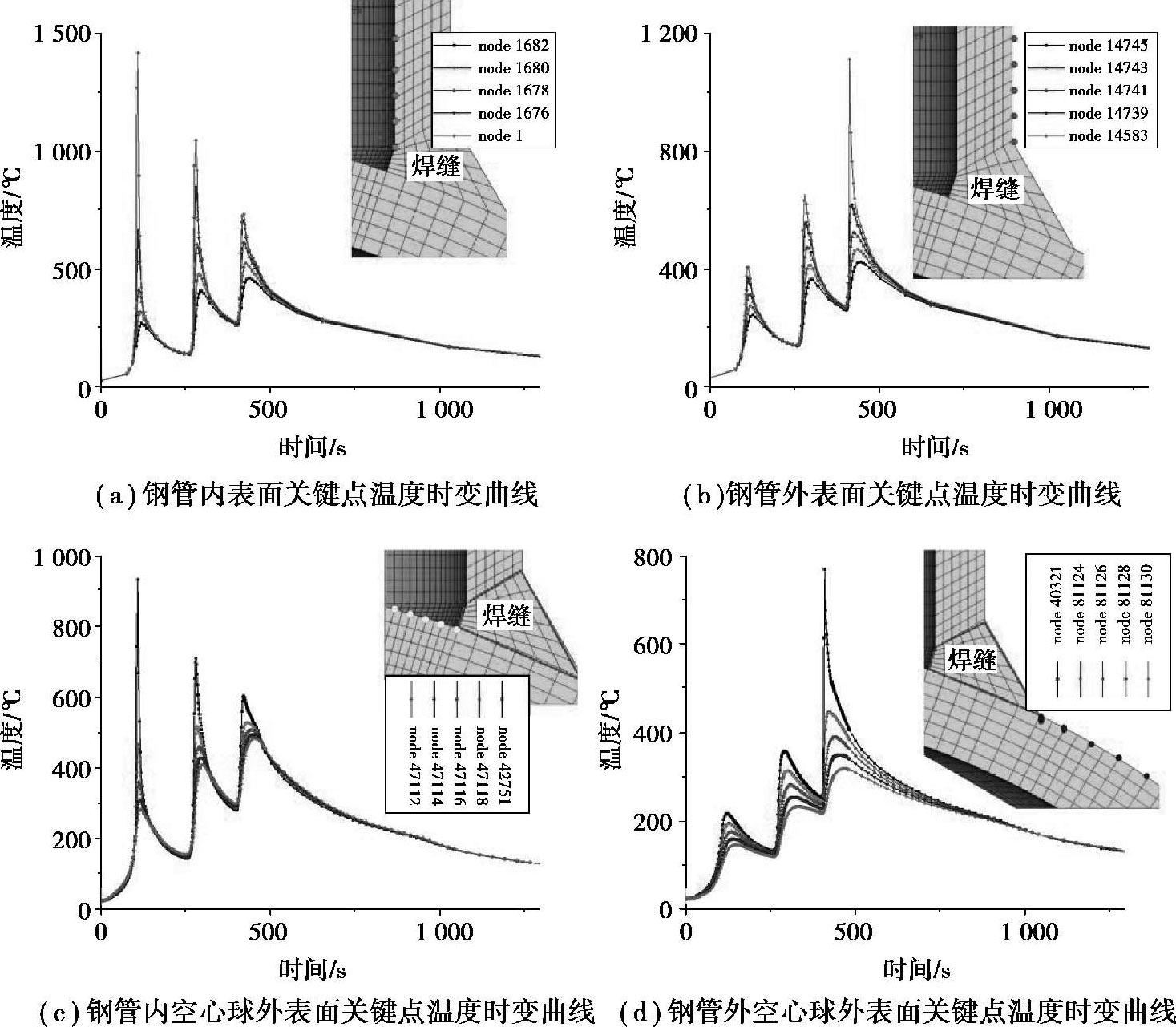 为考查焊缝及热影响区在整个焊接过程中的温度场时变规律,选取 180°截面处焊缝附近的关键点进行分析。在钢管的内、外表面分别从焊缝根部开始沿钢管轴向每隔一个节点选取一个关键点,分析钢管热影响区温度随焊接过程的变化规律,绘制各关键点的温度时变曲线,如图 2.21(a)、(b)所示;在空心球外表面从内外焊趾开始分别沿环焊缝内外侧每隔一个节点选取一个关键点,分析空心球热影响区温度随焊接过程的变化规律,绘制其温度时变曲线如图 2.21(c)、(d)所示。