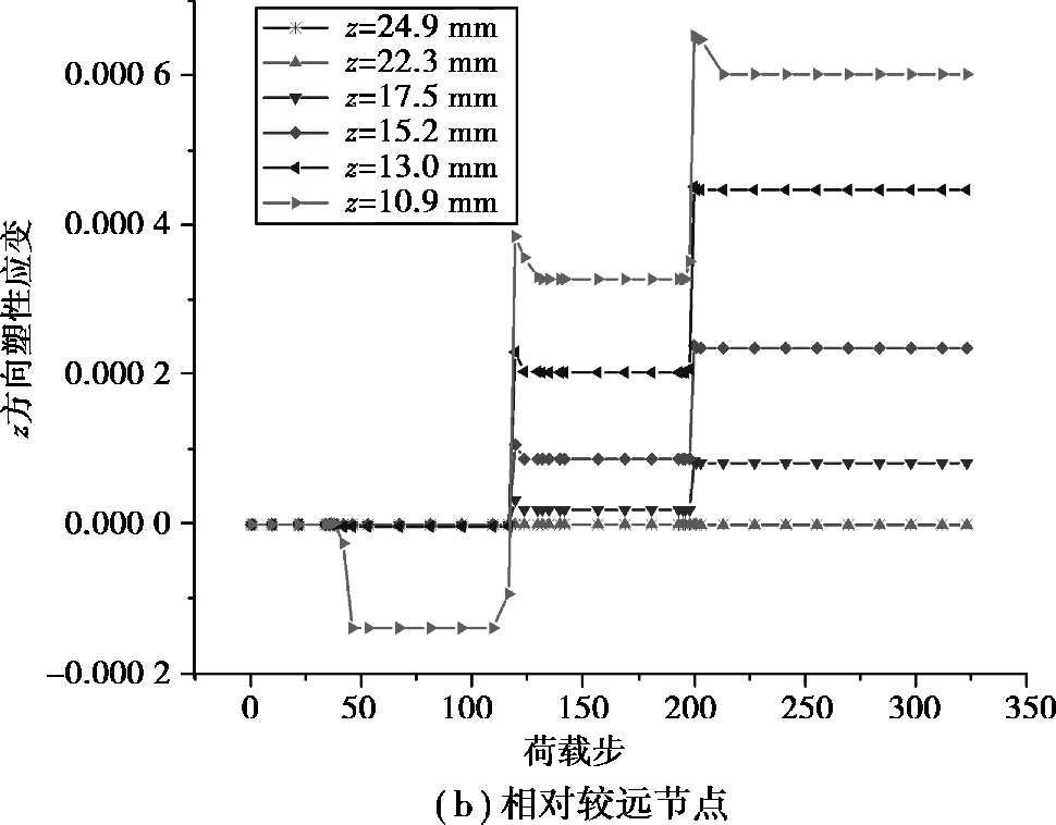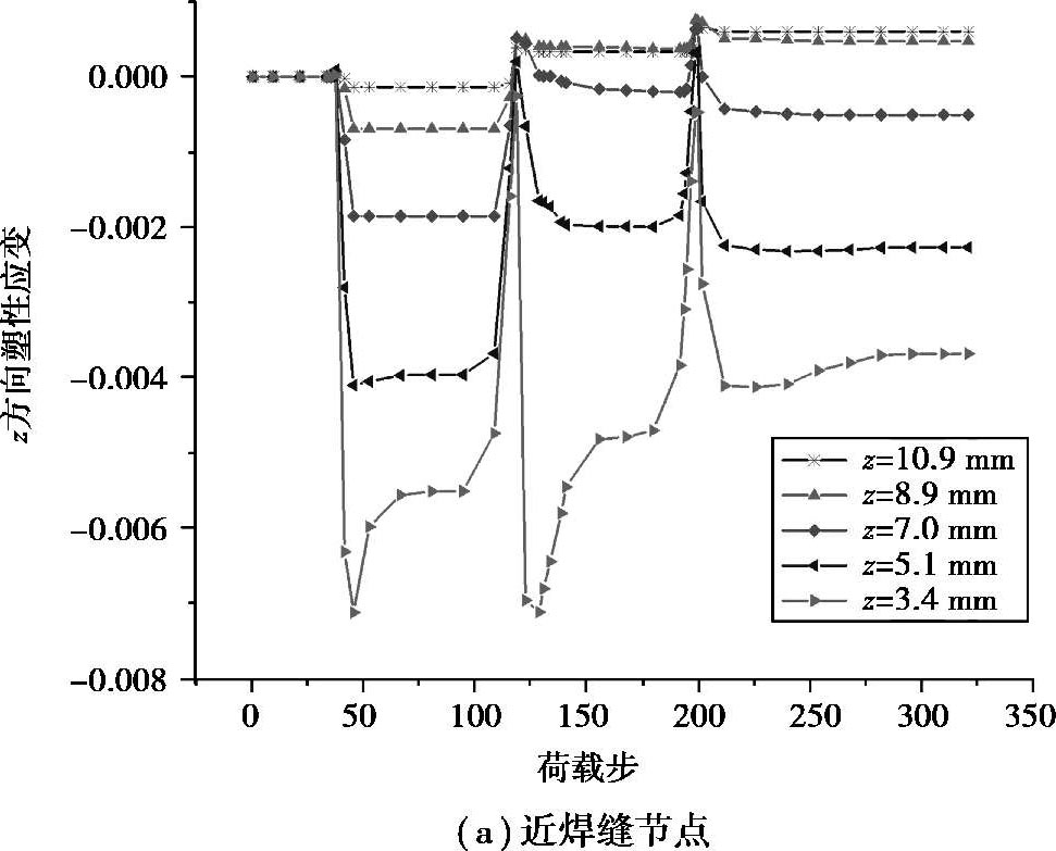 图 2.30(a)为钢管厚度中心靠近焊接位置的节点塑性演变曲线,主要为塑性压应变,随着热源的靠近而产生塑性压应变,之后因为热源远离,部分范围塑性应变因冷却而得到部分恢复。图 2.30(b)为钢管厚度中心距焊缝相对较远处节点的塑性应变曲线,由于离焊缝相对较远,主要受热源靠近时热的膨胀作用,表现为塑性拉应变。