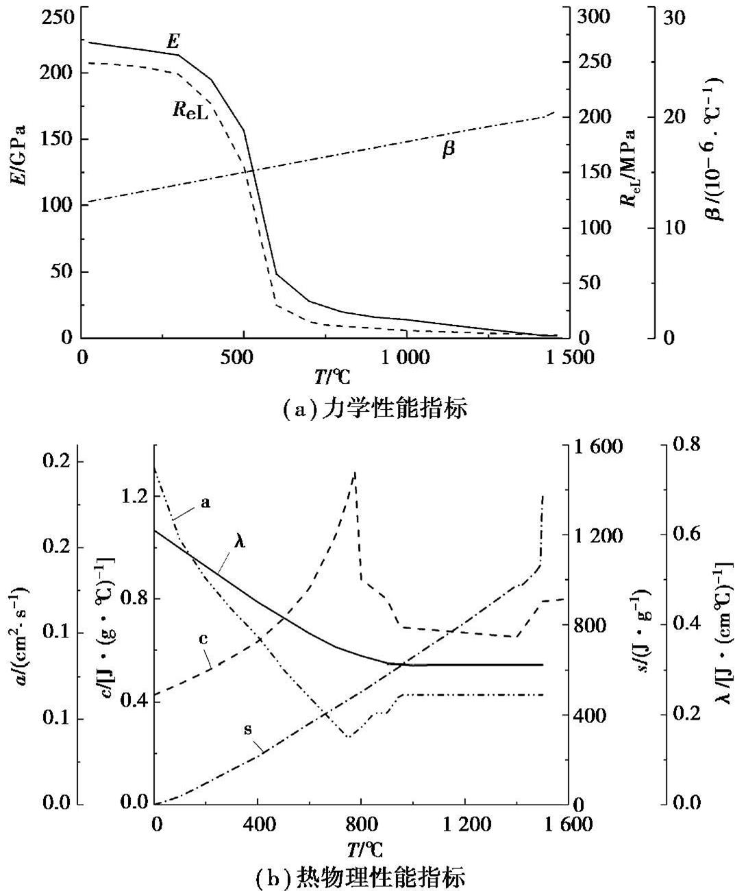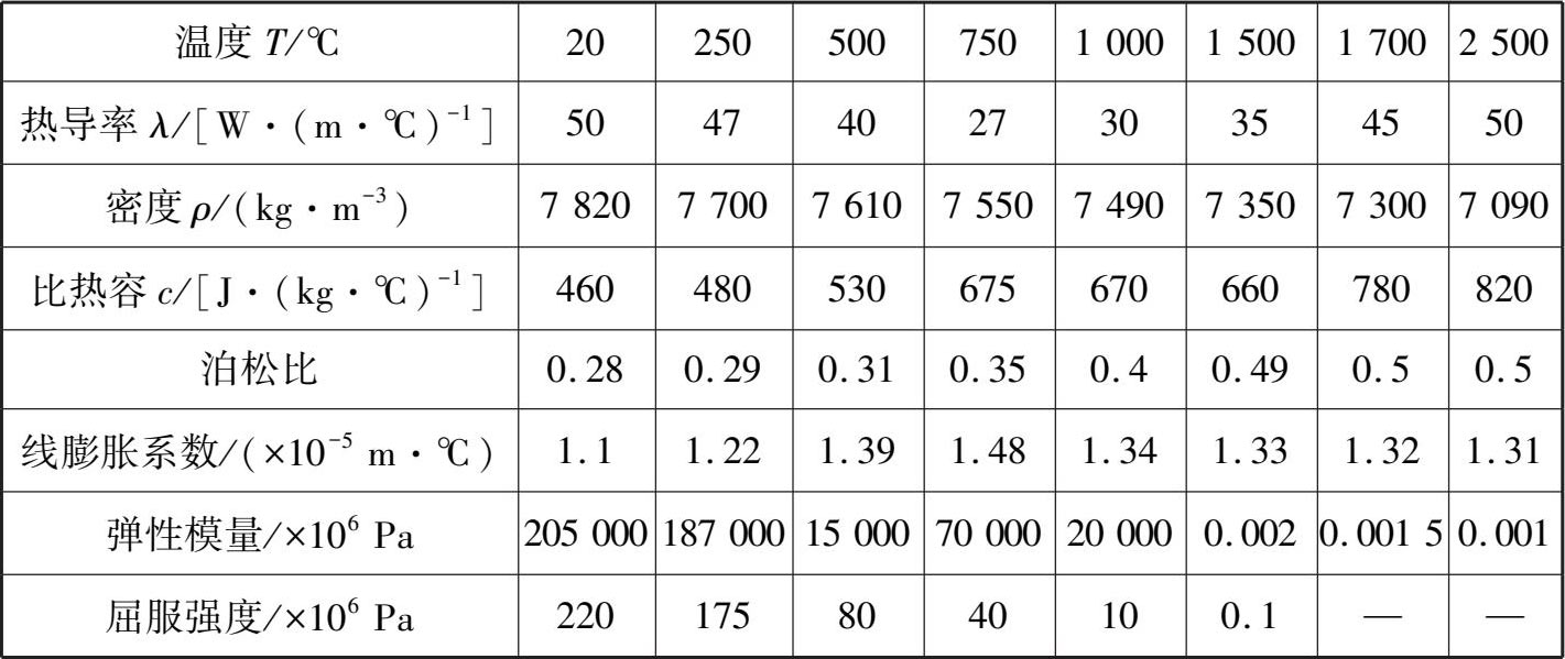焊接空心球节点的焊接过程涉及热、力、材料相变等多个物理过程的耦合效应,利用ANSYS的热-结构耦合分析功能,可对焊缝及其热影响区在焊接过程的温度场进行跟踪分析,并将其温度场准确施加到结构模型上,以获取焊接完成后的非均匀温度效应。为实现热-结构耦合分析,在模拟焊接过程的热分析时将有限元模型的所有单元均定义为SOLID70 单元,在结构应力分析时再将所有单元转换为SOLID185 单元。假定焊材和母材均为Q235 材质,均具有相同的属性,并考虑其随温度发生实时变化,见表 2.3 和图 2.16。