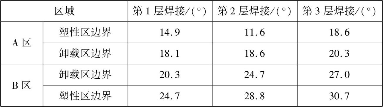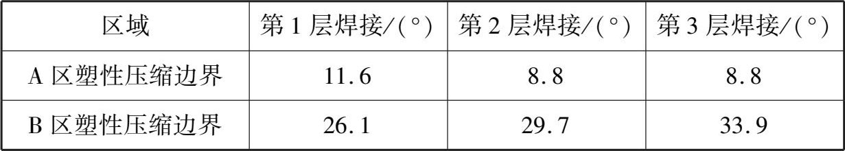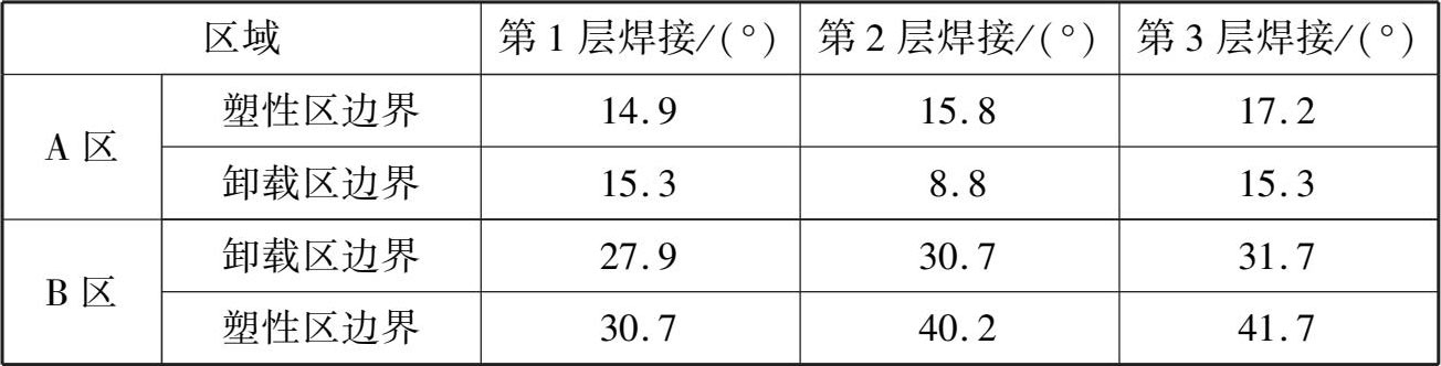 从图 2.32 中可以看出,在焊接第1 层焊缝的过程中,空心球外表面塑性压缩边界在A区 φ = 14.9°位置、B区 φ = 30.7°位置。随着热源远离,焊缝开始冷却,塑性应变卸载边界在A,B区分别为 φ = 15.3°位置和 φ = 27.9°位置,但是冷却卸载不能完全抵消热源靠近时产生的塑性应变,且卸载区域完全在压缩区域范围内。在焊接第2 层焊缝的过程中,空心球外表面塑性压缩边界分别为 φ =15.8°位置、 φ = 40.2°位置,与焊接第1 层不同,在A区,所有塑性压应变全都因冷却收缩而转化为塑性拉应变,收缩边界发展到 φ = 8.8°位置,B区则与第1 层焊接相似,收缩范围在压缩范围内,边界为 φ = 30.7°位置处。在焊接第3 层焊缝的过程中,空心球外表面塑性压缩边界分别为 φ = 17.2°位置、 φ = 41.7°位置,冷却收缩范围有所减小,分别为 φ = 15.3°位置、 φ = 31.7°位置。各层焊接中,空心球外表面塑性应变临界位置见表 2.7。