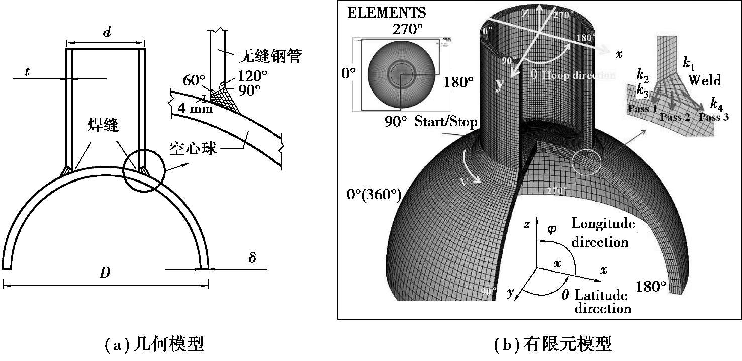 空心球节点的几何构造如图 2.15(a)所示,为了提高数值模拟的计算效率,根据空心球节点的对称性,建立球-管焊缝连接节点的 1 /2 模型,下面以试件SJ7 为例,详细介绍有限元模型的建立过程。