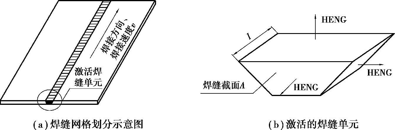 除明确焊接模拟过程温度荷载的量值外,还需模拟焊接时热源的移动与焊缝的生成。ANSYS中的“生死单元技术”通过“杀死”单元(修改单元的刚度至极小值),使与此单元相关的单元矢量荷载(如压力、温度)零输出;“激活”单元,则使单元参数恢复至正常状态 [58] 。建立有限元分析模型时将焊缝划分为若干单元,如图 2.17(a)所示;假定每个单元具有恒定的体生热率HENG,如图2.17(b)所示。