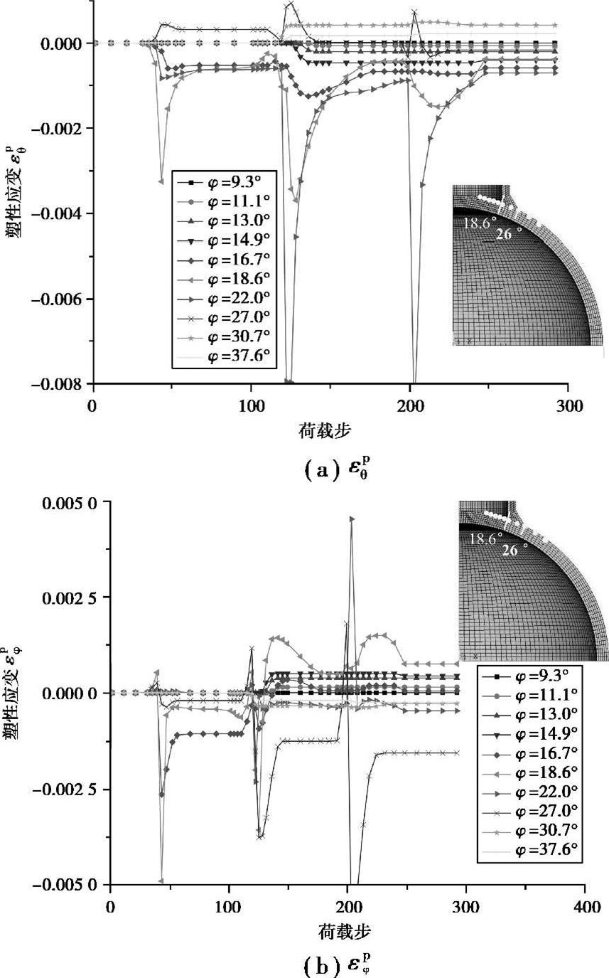 从图 2.34 中可以发现,各塑性应变曲线随热源靠近而增加,但热源离去后并没有直接减小,说明在焊接空心球内表面不会因热源远离而产生塑性卸载区域。当热源从第2 层焊缝末尾进入第3 层焊缝时,因热源靠近,温度升高,致使材料强度降低,进而导致塑性应变有部分卸载,当焊接结束进入冷却阶段时,仍有部分区域卸载。在 3 层焊缝焊接过程中,A区塑性压缩区域边界分别为 φ =11.6°位置、 φ = 8.8°位置、 φ = 8.8°位置;B区塑性压缩区域边界分别为 φ = 26.1°位置、 φ = 29.7°位置、 φ = 33.9°位置。在各层焊接中,空心球内表面塑性应变临界位置见表 2.9。