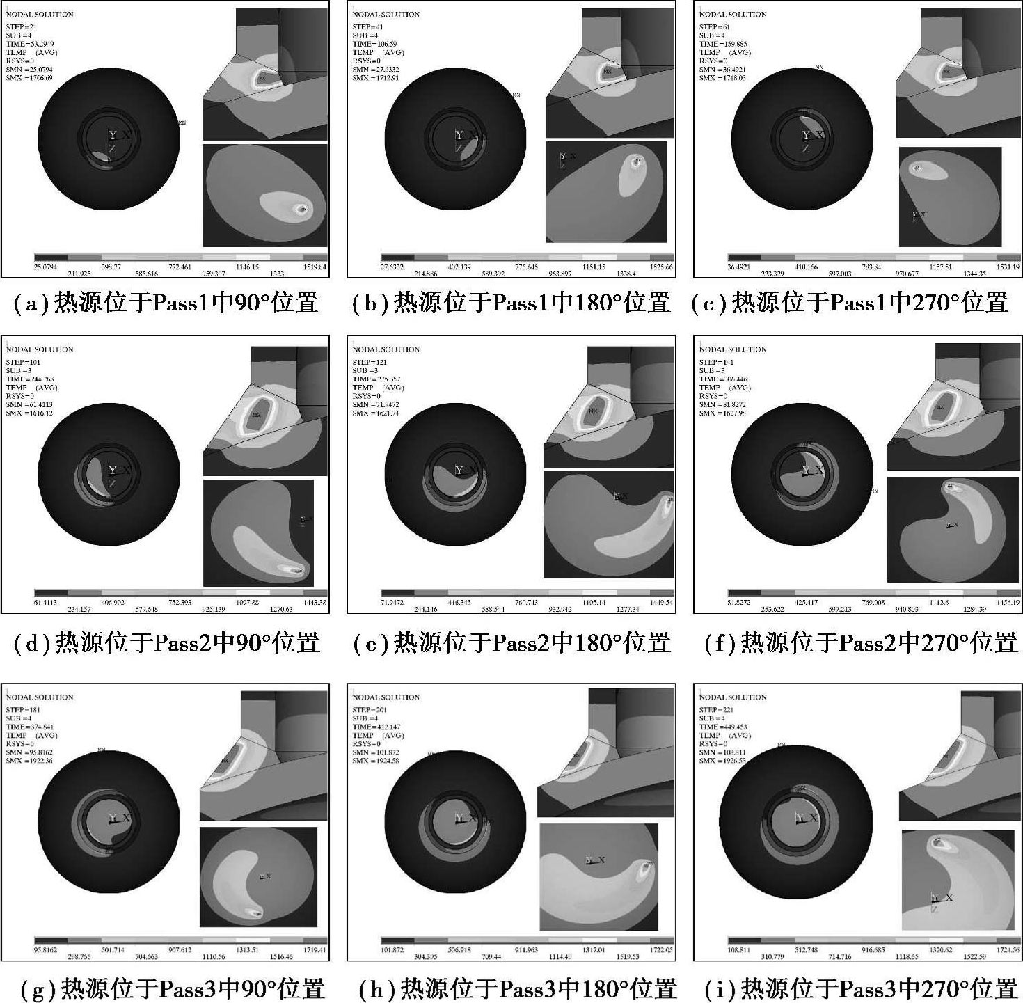 如前所述,焊接过程中焊接热源在焊道上从 0°位置逆时针经过 90°,180°,270°,360°依次循环 3 次完成焊层 1,2,3 的焊接。提取焊接热源分别经过三层焊缝的 90°,180°,270°位置时的温度场分布云图,如图 2.20 所示,图中左侧位置是模型整体俯视图,右上位置是热源中心剖面图,右下位置是空心球外表面俯视图。