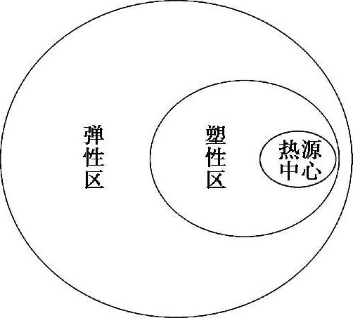 为便于后文描述,将塑性应变临界位置与热源中心的距离定义为热源塑性影响区,如图 2.23所示,进入此区域将由不均匀的温度场造成的不均匀膨胀而产生塑性变形,在此区域外不均匀温度膨胀不足以产生塑性变形。由温度场分析可知,在热源的不同方向,温度梯度不同,热源塑性影响半径也不同。