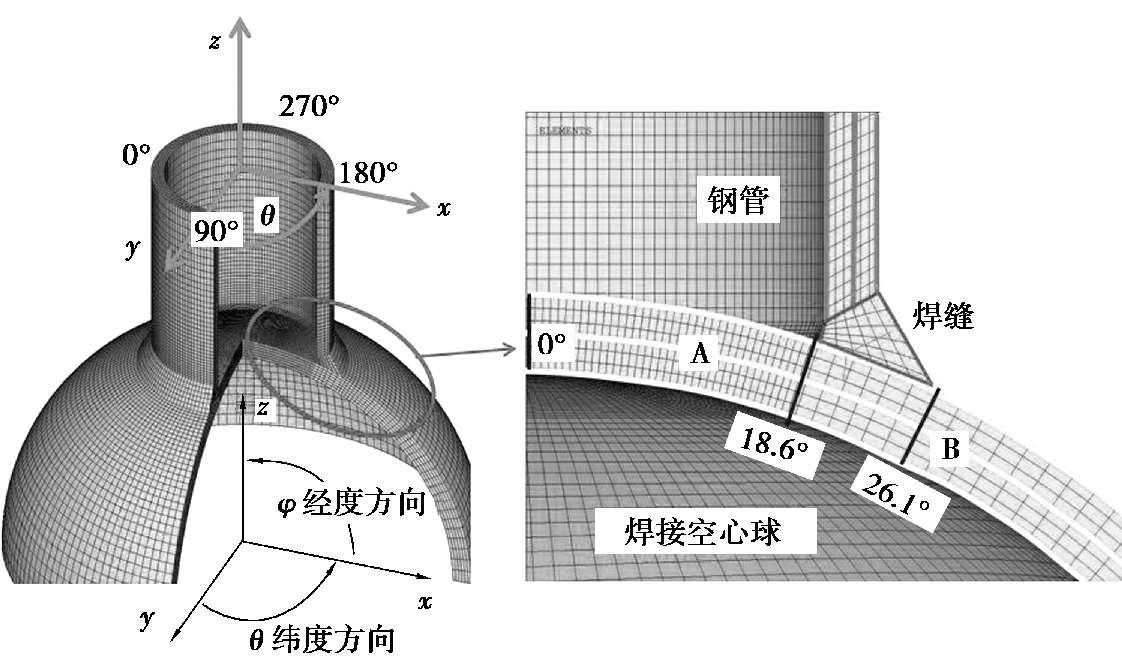 显然,为了便于分析,图 2.28 中以焊缝中心为界限,将空心球分为A区和B区(详见图 2.28)。下面在球坐标系中,从A,B区分别讨论焊接过程中空心球上塑性应变演化规律。为便于描述,将空心球在钢管内部中心位置设为 φ =0°,左侧焊趾位置 φ = 18.6°,右侧焊趾位置 φ = 26.1°。