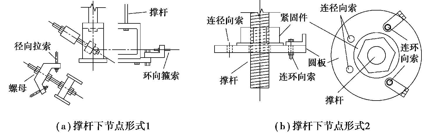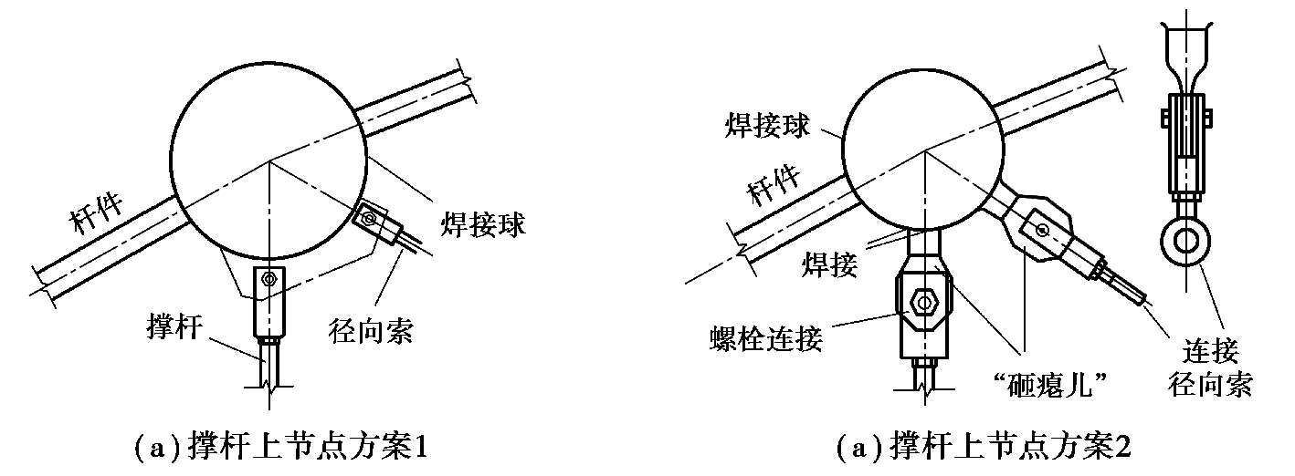 撑杆上节点是上层刚性网壳与下部柔性索杆体系的连接节点,就具体构件而言,此种节点一般是径向拉索、撑杆和上层网壳节点的汇交节点。一方面上层荷载通过上弦节点传递给下部索撑体系,另一方面下部索撑体系在施加预应力后通过此节点对上层网壳起到一个弹性支承作用,可近似理解为上层网壳的弹性支座。