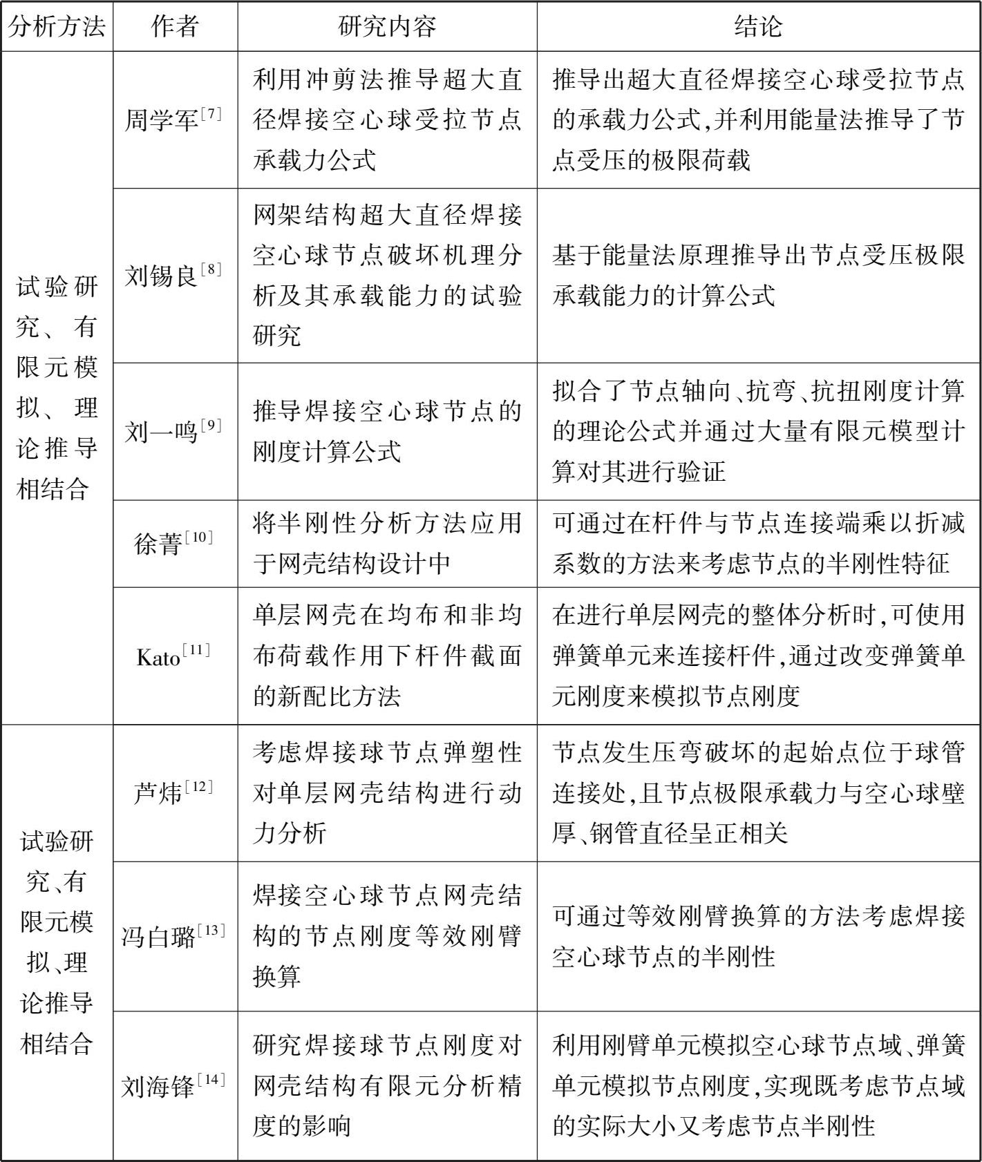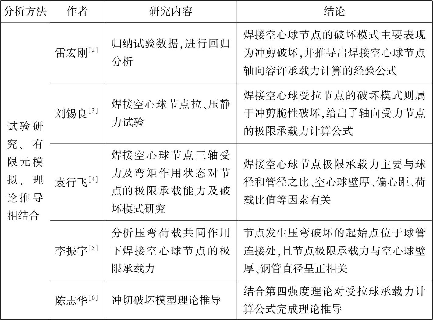 表1.2 焊接空心球节点力学性能分析方法