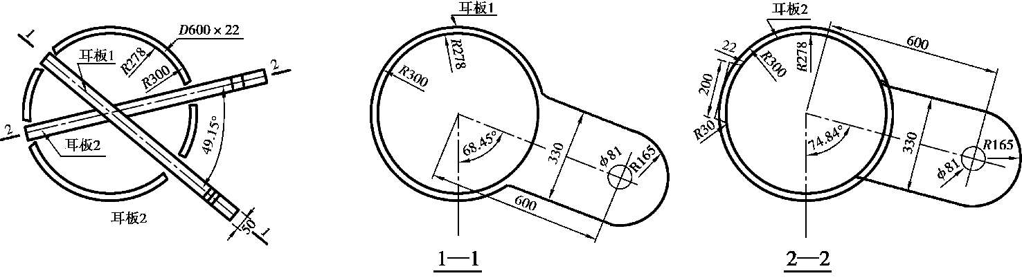 为了满足撑杆上节点的结构功能要求,该节点处,径向拉索和撑杆均径向铰接在上层网壳节点。文献[1]提出了两种撑杆上节点形式,图 1.5(a)是在网壳焊接球的下部沿径向设置一异形板,并将撑杆与异形板通过螺栓连接;图 1.5(b)是在焊接球下方焊接一块一端压瘪的短管,并通过螺栓将撑杆与压瘪端连接。文献[1]通过分析认为图 1.5 提出的两种撑杆上节点方案虽然都实现了撑杆的径向转动,但是需要对连接构件进行精加工,成本较高,同时现场施工也显得较为烦琐;从受力方面看,方案 1 相比方案 2,其强度更容易得到保证。随着弦支穹顶结构规模的增大,笔者认为如图 1.5(a)所示的撑杆上节点方案 1 也不能满足撑杆上节点处的较大内力,因此可考虑在此方案的基础上,在焊接球内部沿径向索方向设置加劲肋,并使连接径向索的耳板与加劲肋形成整体,保证传力可靠性的同时加强焊接球的稳定性。图 1.6 所示为山东茌平体育馆弦支穹顶工程中采用的撑杆上节点。该节点在焊接空心球节点的基础上稍有改进,将连接径向拉索的两块耳板贯穿焊接空心球,其中,耳板 2 在与耳板 1 相交处剖断后焊接成X形再与空心球焊接成整体,耳板的位置根据径向索的方向确定,这样耳板除了起到耳板的连接作用外,还起到加劲肋板的作用,可防止空心球局部失稳。