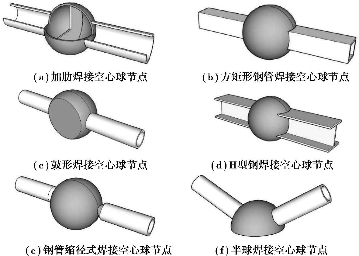 为了大幅度地提升焊接空心球节点的承载能力,常在节点的空心球内部添加肋板,称为加肋焊接空心球节点,其构造形式如图 1.4(a)所示。加肋与否也是焊接空心球节点最常用的分类标准。此外,还可按焊接空心球节点的核心球体或连接钢管的特殊形式进行分类,包括方矩形钢管焊接空心球节点[图 1.4(b)]、鼓形焊接空心球节点[1.4(c)]、H型钢焊接空心球节点[1.4(d)]、钢管缩径式焊接空心球节点[1.4(e)]、半球焊接空心球节点[1.4(f)]等。