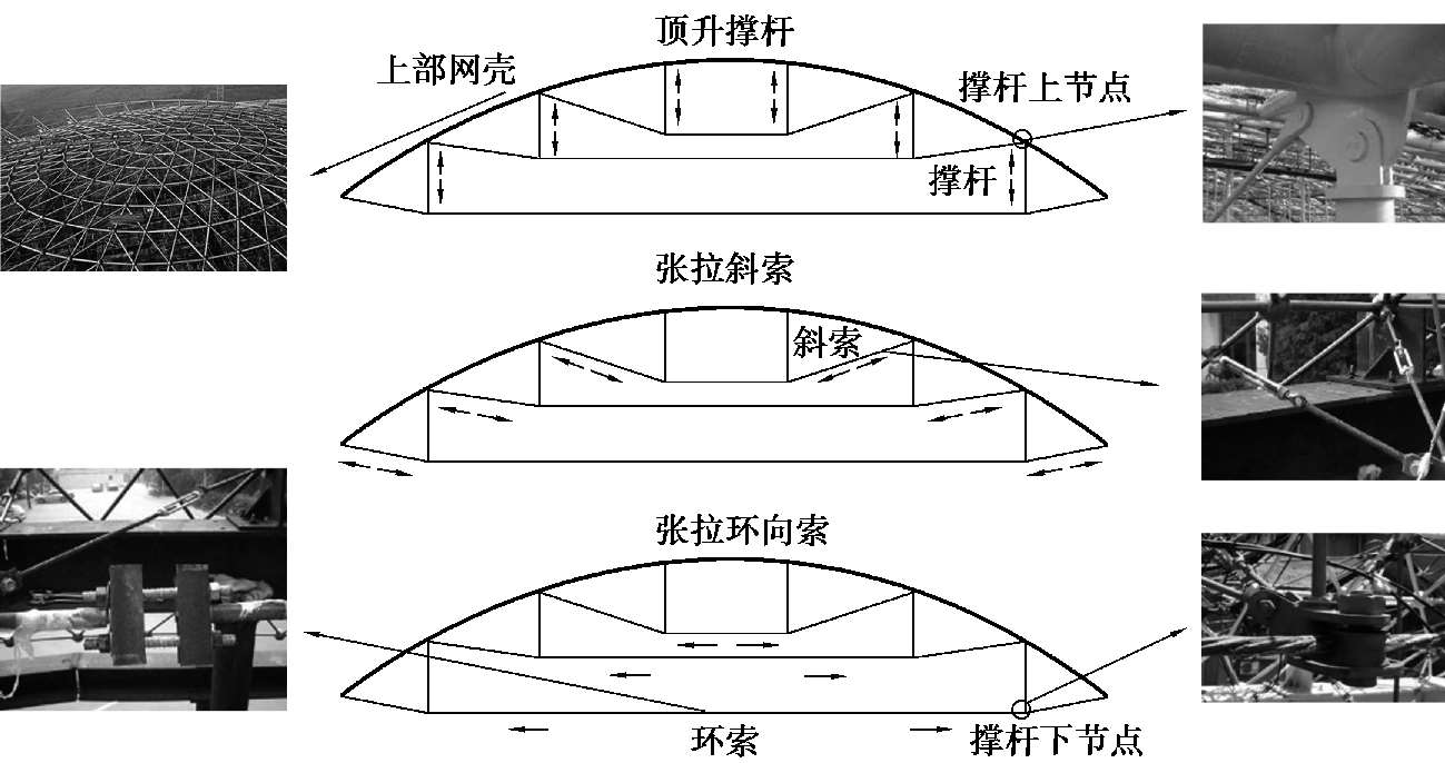 弦支穹顶结构预应力施工方法目前主要有 3 种:张拉环向索、张拉径向索和顶升撑杆,如图 1.15 所示。其中,张拉环向索是将张拉点布置在环向拉索上,利用张拉设备对环向索施加预应力使环向索伸长,然后将环向索不同索段相互固定;张拉径向索是将环向索长度和撑杆长度调整好后,直接对径向索张拉建立预应力,径向索张拉完成后通过索头锚具将拉索固定;顶升撑杆是通过调节撑杆长度来建立预应力的一种间接预应力施加方法。实际工程中,预应力的施加方法应根据张拉设备、同步性控制能力、预应力设计值等多个指标进行选用。