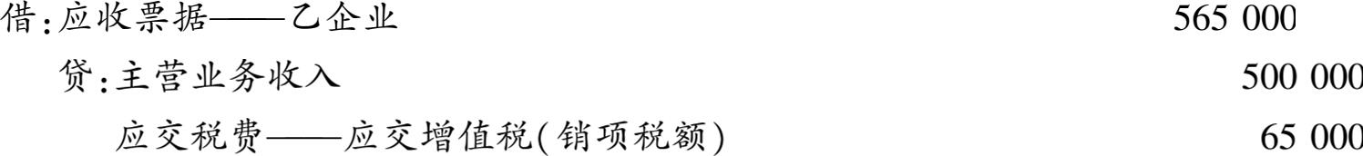 【例3-1】 甲企业为增值税一般纳税人,9月1日向乙企业销售一批产品,价款为500000元,适用的增值税税率为13%。双方商定以商业汇票结算。收到乙企业交来的不带息商业承兑汇票,面值为565000元。甲企业账务处理如下: