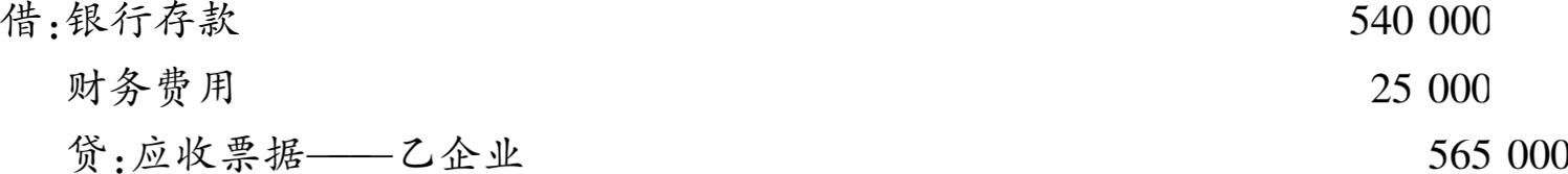 【例3-5】 沿用【例3-1】的资料,假设甲企业在商业汇票到期前因急需资金,将所持汇票贴现给银行,且银行不拥有追索权,银行贴现利息为25000元。
