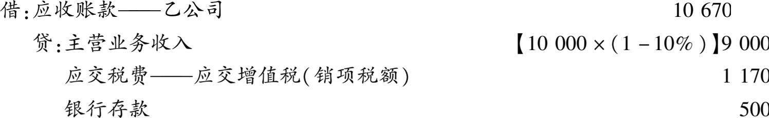 【例3-6】 甲公司赊销给乙公司商品一批,按价目表的价格计算,货款金额总计10000元,给购货方的商业折扣为10%,适用的增值税税率为13%。代垫运杂费500元(假设不作为计税基数)。甲公司的账务处理如下: